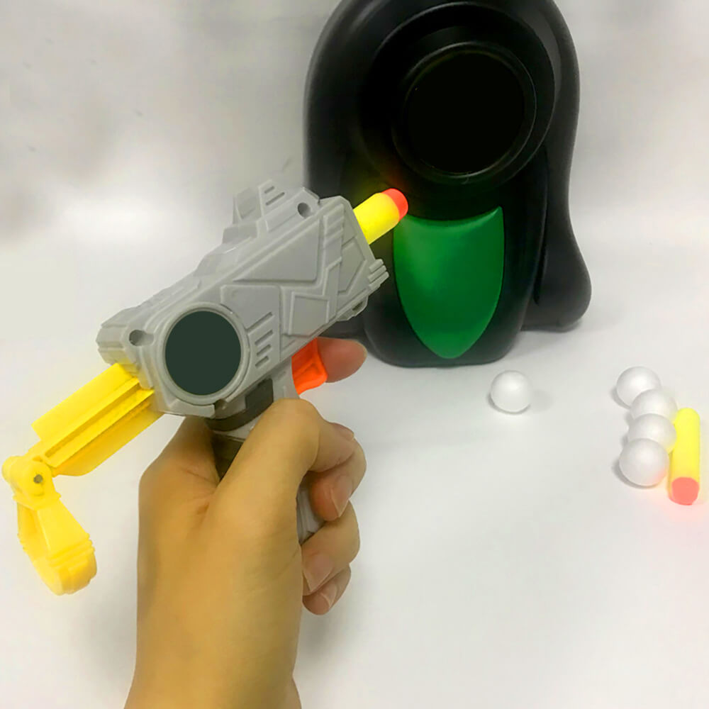 This game features a pneumatic blaster with 6 foam darts and 12 light emitters glowing in soft polystyrene foam balls. Play alone or with friends. The ultimate target shooting game is back and better than ever!